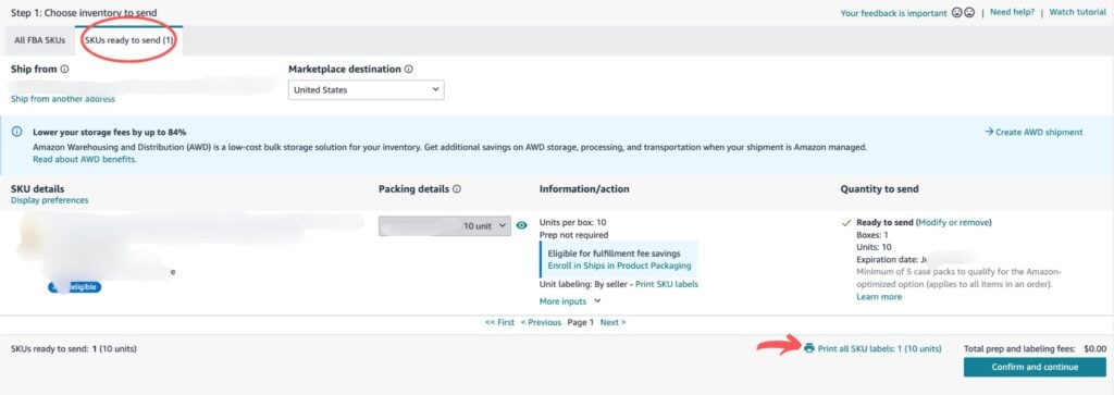 - Amazon also indicates which SKUs labels need to be printed, where it says: “Print all SKU labels: # (# units) at the bottom of the send to Amazon workflow.